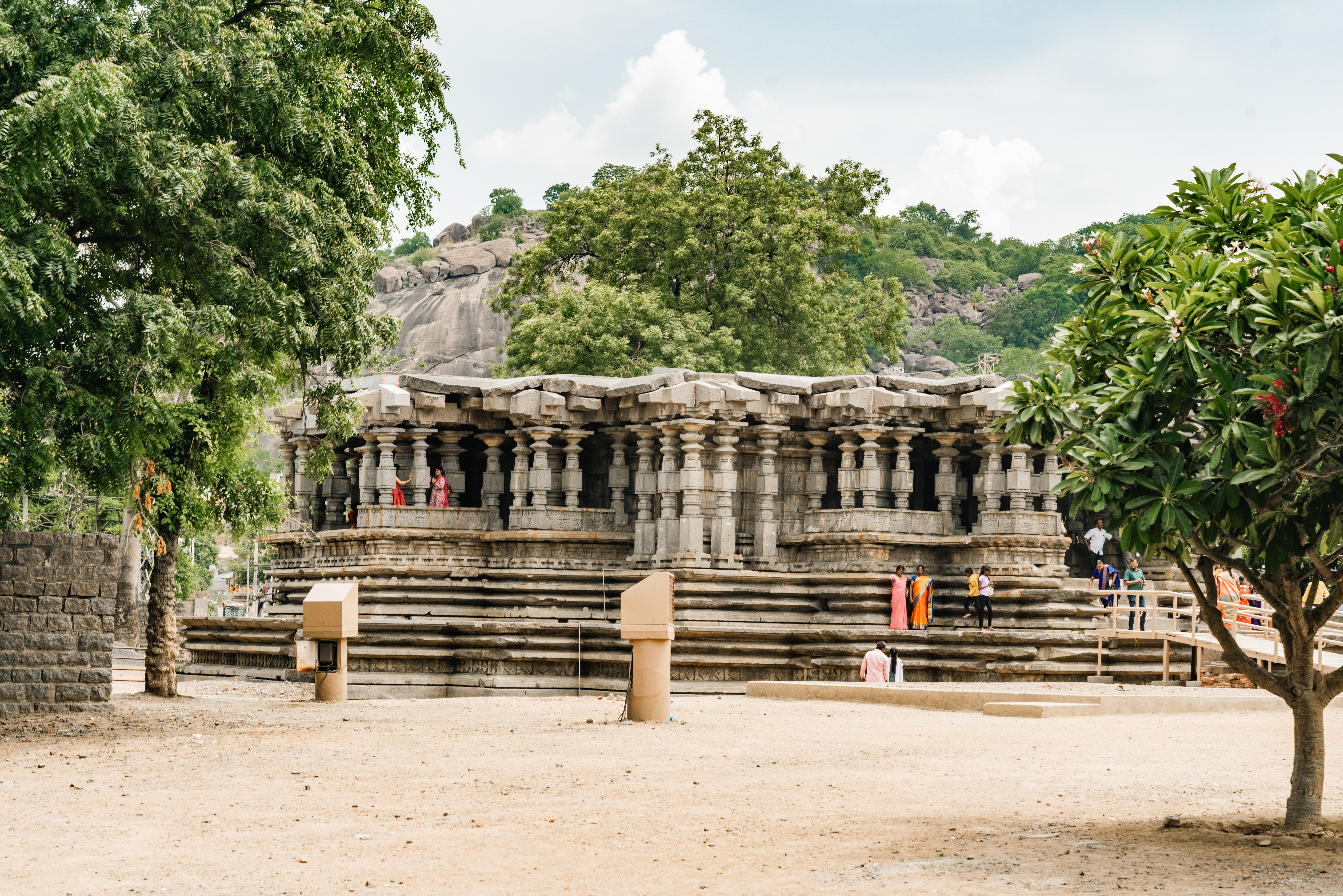 History Constructed in 1163 AD by King Rudradeva, the Thousand Pillar Temple stands as a testament to the artistic and architectural achievements of the Kakatiya dynasty. Named after King Rudra Deva, the temple was built under the expertise of the Vishwakarma sthapathis, master architects of the Kakatiya period. Originally dedicated to Lord Shiva, the temple also honors Lord Vishnu and Lord Surya as its secondary deities. The temple’s grandeur was marred during the invasion of the Tughlaq Dynasty, which caused significant damage to the structure. Despite this, the temple remains a symbol of the Kakatiya architectural legacy and was renovated by the Government of India in 2004. Managed by the Archaeological Survey of India, it has been declared a protected monument and continues to attract visitors and devotees alike. Lore The legend behind the temple’s construction is steeped in historical and religious significance. It is said that the temple was designed to symbolize the unity of the divine trinity and to honor King Rudradeva’s devotion to Lord Shiva. The intricate carvings and the unique star-shaped layout reflect the artistic and architectural achievements of the Kakatiya dynasty. The temple’s exquisite sculptures, including the monolith of Nandi and the detailed carvings on the entrance, are a testament to the skill of the Vishwakarma sthapathis, the master architects of the time. Despite suffering damage during the Tughlaq Dynasty invasion, the temple’s enduring beauty and historical importance continue to captivate visitors and devotees. Architecture The Thousand Pillar Temple, also known as the Sri Rudreshwara Swamy Temple, is a remarkable example of Kakatiya architectural brilliance, constructed in the 12th century during the reign of King Rudradeva. Located at the base of Hanamkonda Hill, this temple is renowned for its intricate architectural style, influenced by Chalukyan temples. The temple is designed in a star-shaped layout and features three main shrines dedicated to Lord Shiva, Lord Vishnu, and Lord Surya, collectively known as Trikutalayam. The central shrine is dedicated to Lord Shiva, facing east, while the shrines of Lord Vishnu and Lord Surya face south and west, respectively. The temple's structural beauty is enhanced by its richly carved pillars and captivating sculptures, including a large monolith of Nandi, Lord Shiva’s divine bull, carved from a single stone. The temple is surrounded by a well-maintained garden with small Shiva Lingams, adding to its serene ambiance. The entrance is flanked by intricately carved elephant sculptures, and the ceilings and exterior walls are adorned with elaborate carvings. |